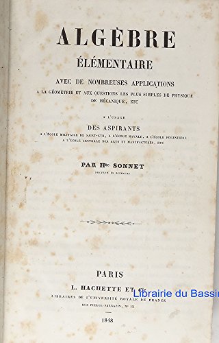 IV + 366 p. Sciences. Mathématiques. A l'usage des aspirants au baccalauréat es sciences, à l'école militaire de Saint-Cyr, à l'école navale, etc. Algèbre élémentaire avec de nombreuses applications à la géométrie et aux questions les plus simples de physique, de mécanique, etc